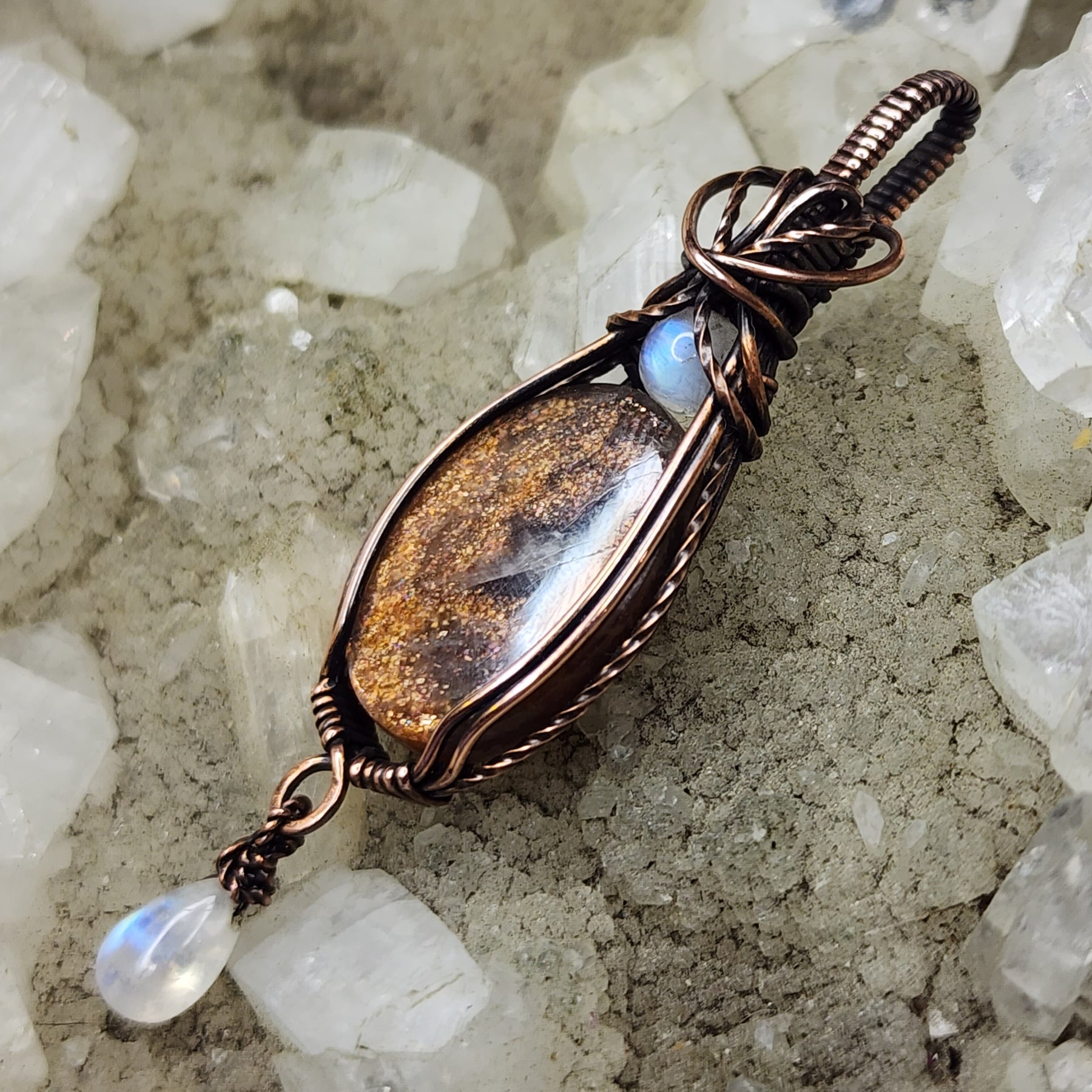 Tanzanian Sunstone and Rainbow Moonstone wrapped in sweeping Copper, antiqed and polished by hand.