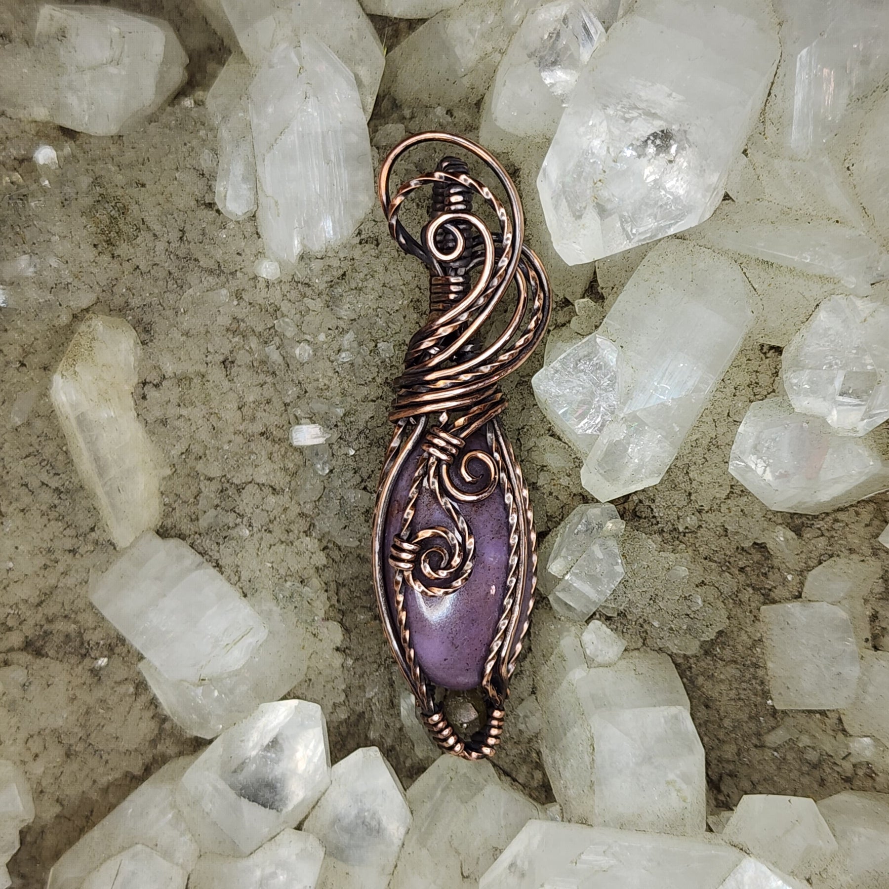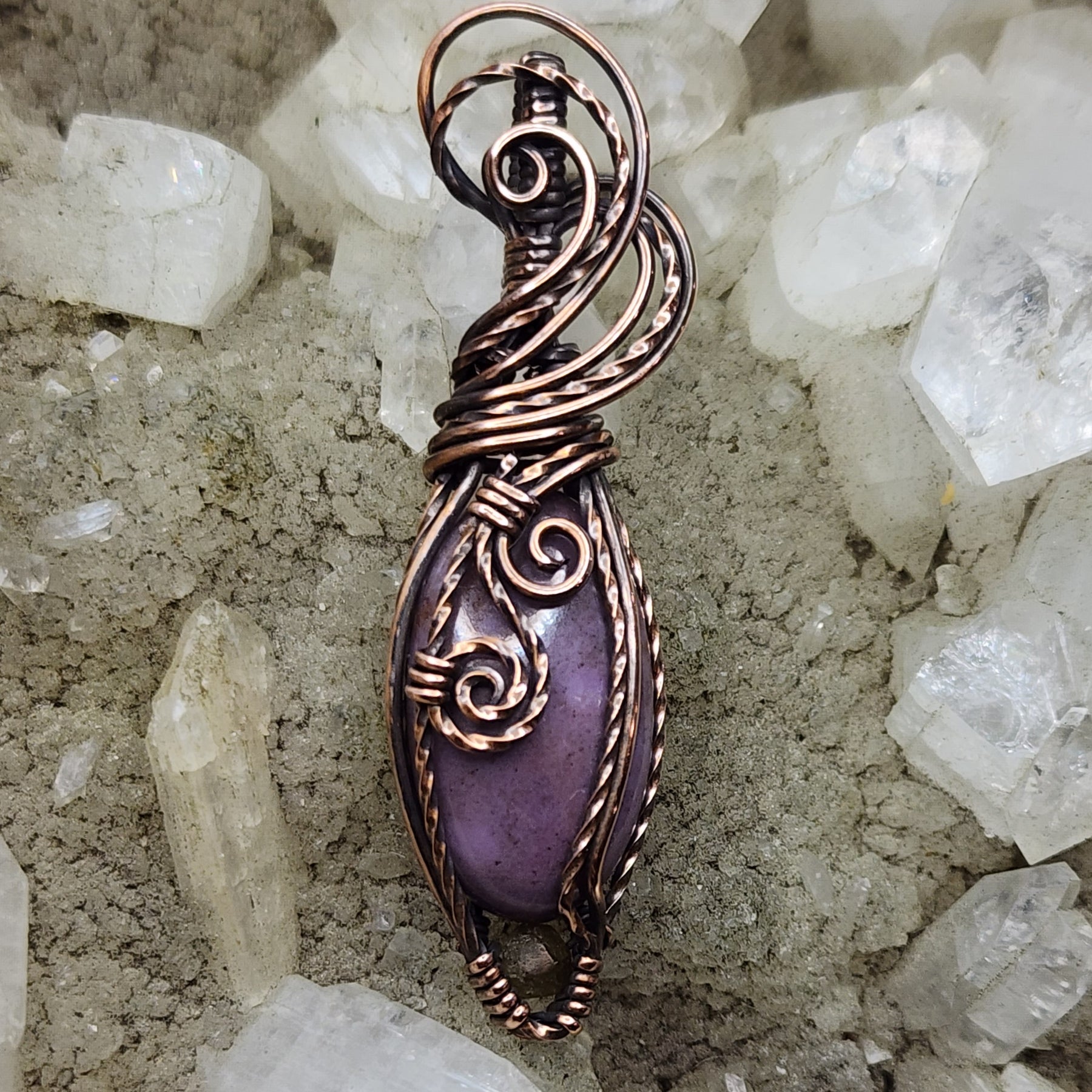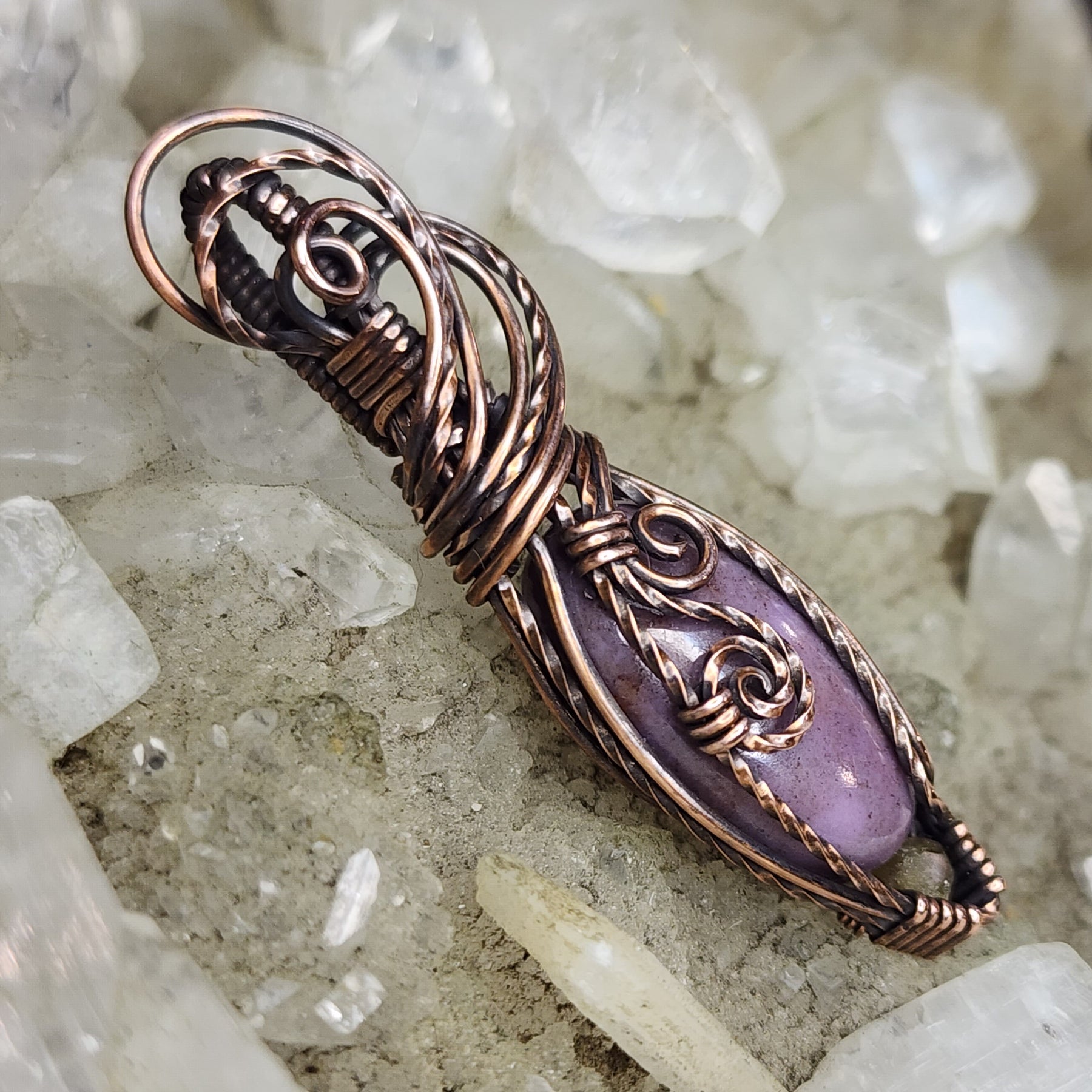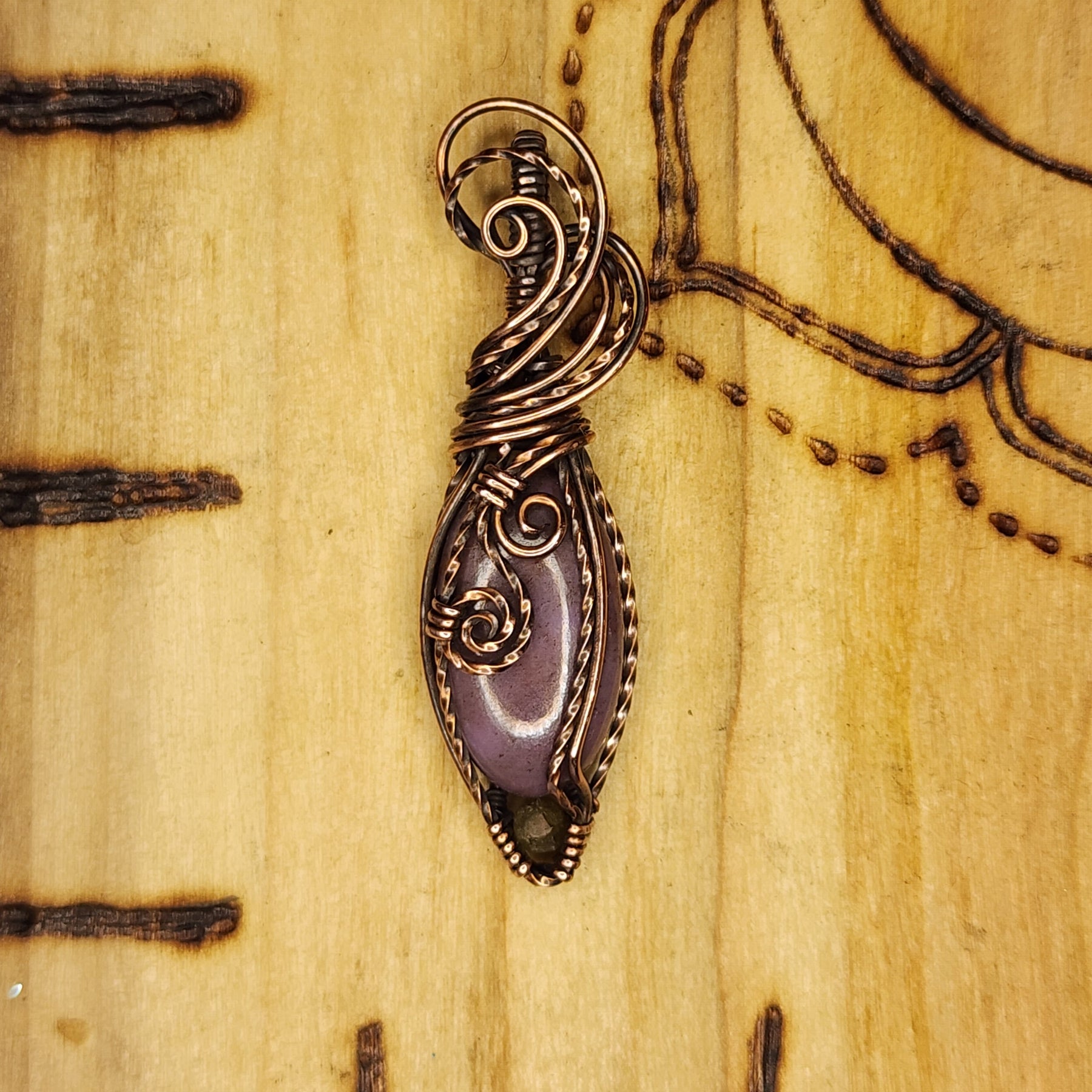 Turkish Purple Jade accented with sphene, wrapped in swirling Copper, antiqued and polished by hand.