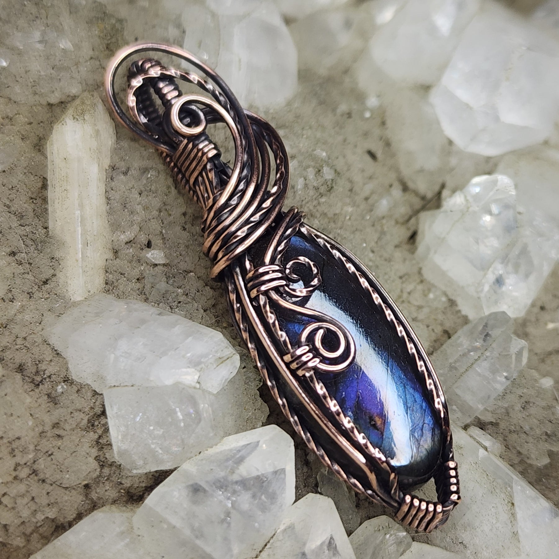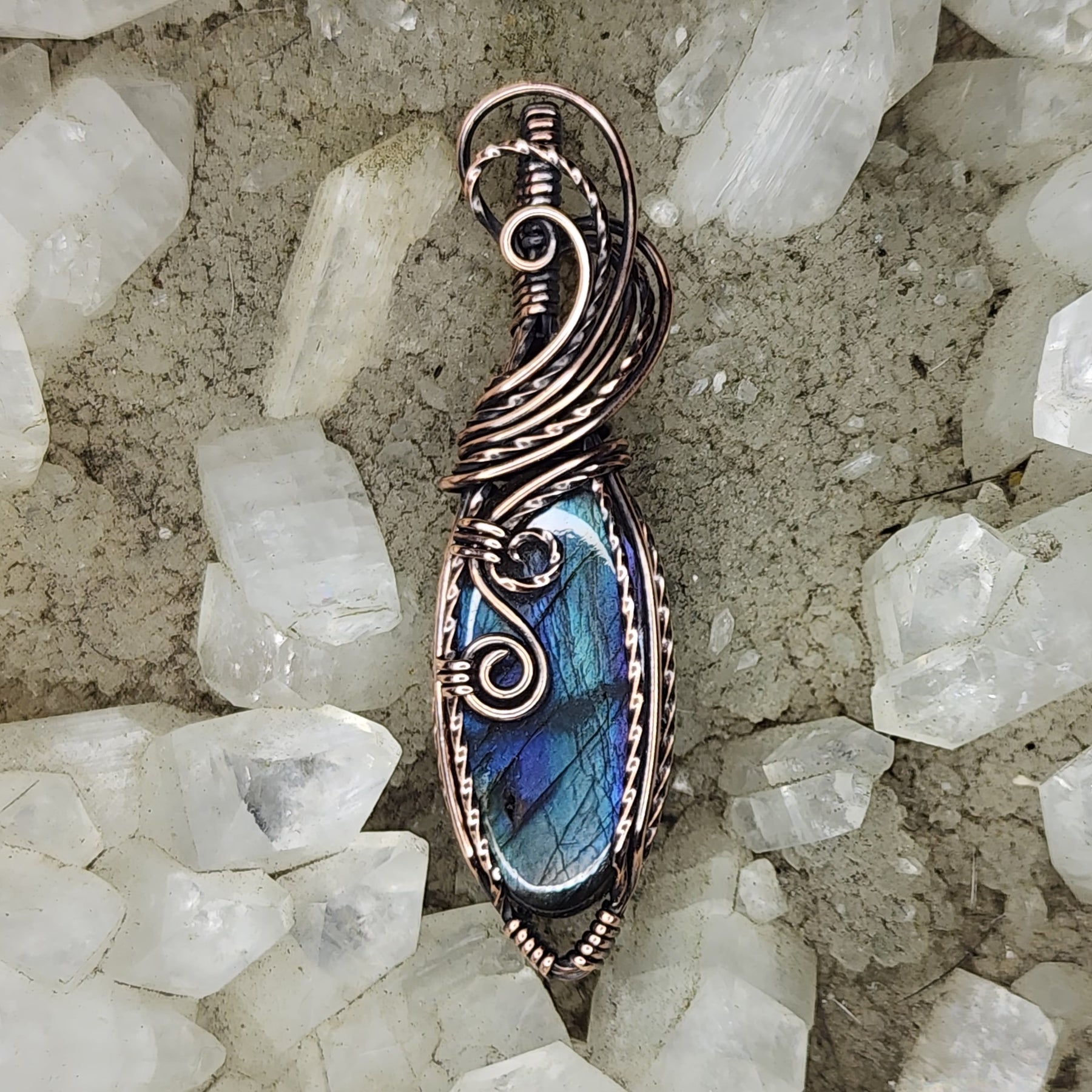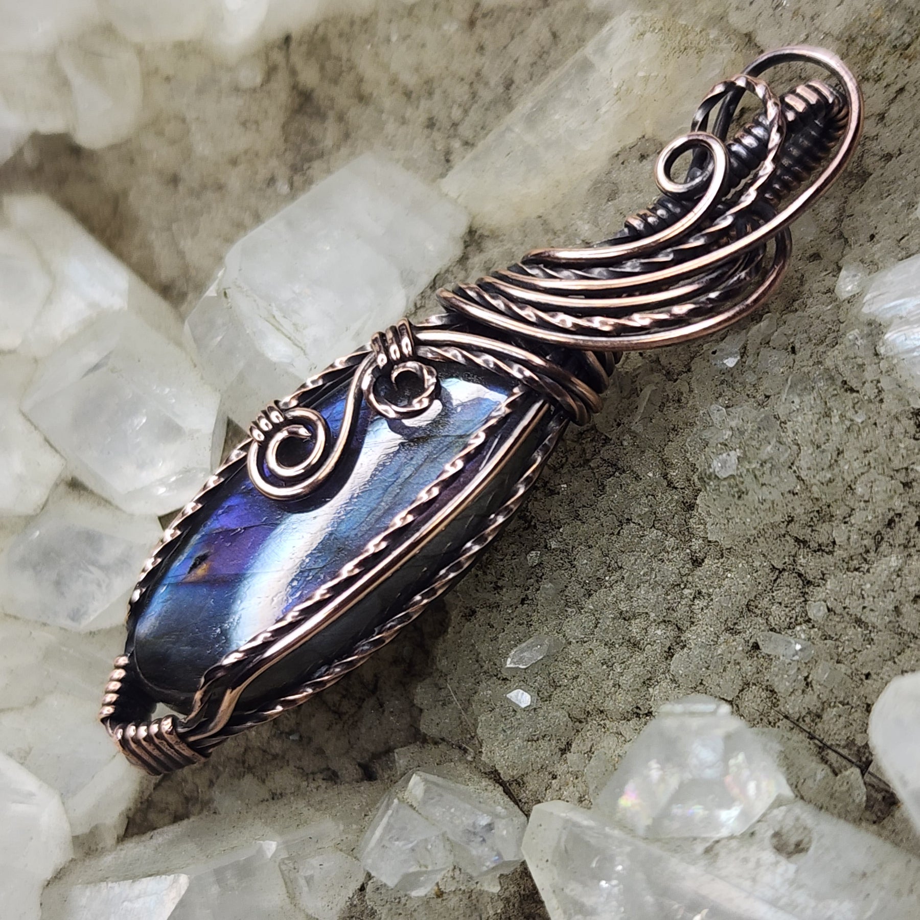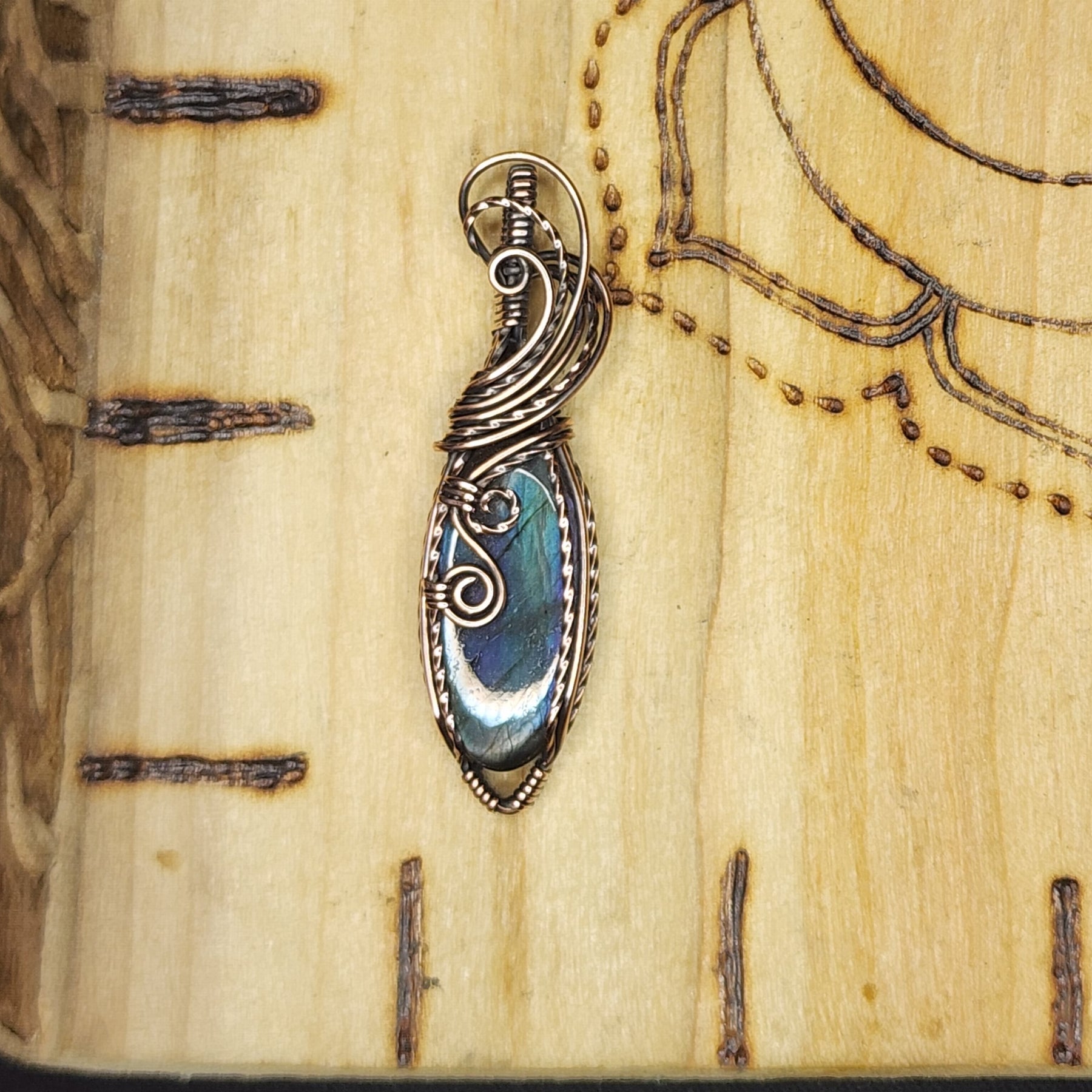 Labradorite wrapped in swirling Copper, antiqued and polished by hand.