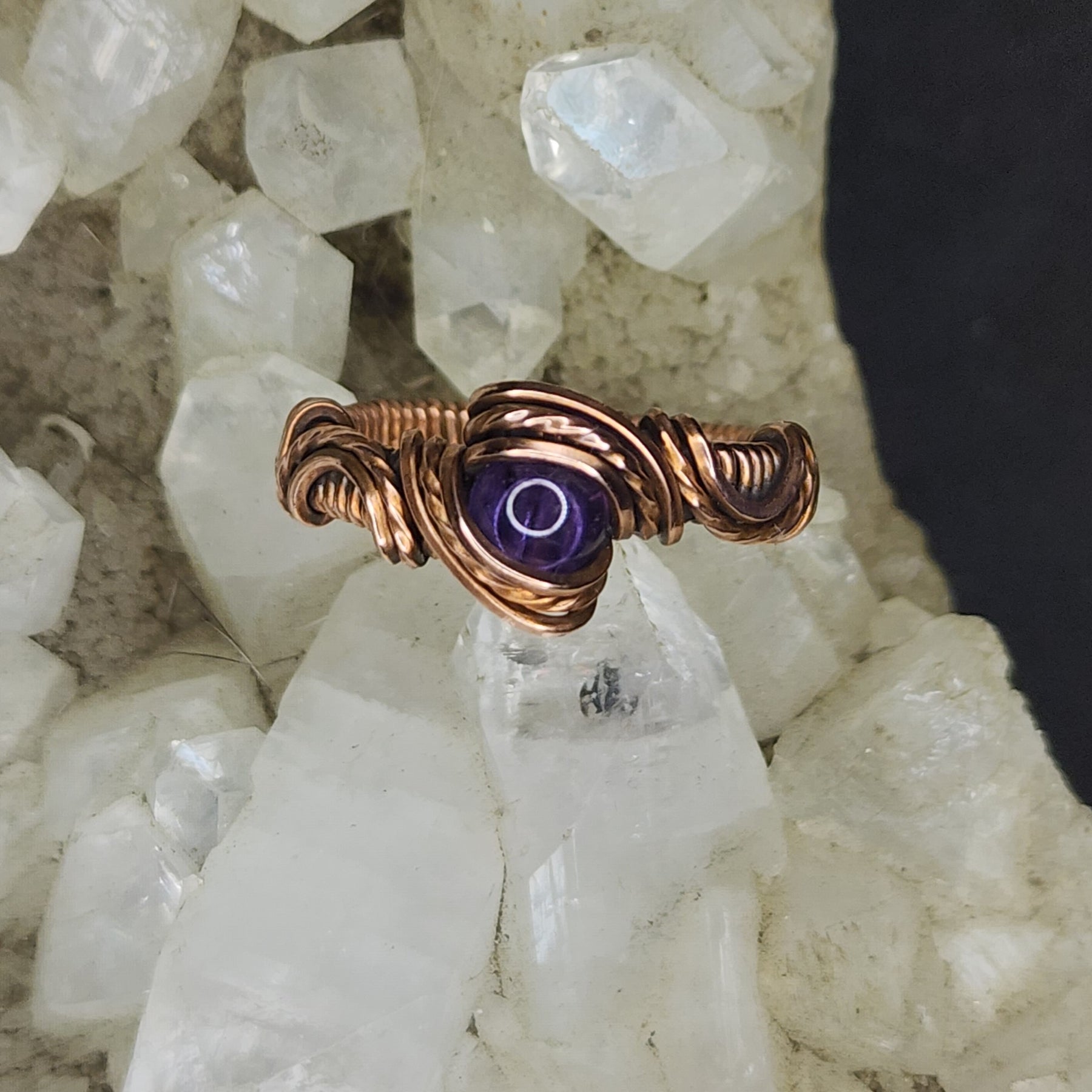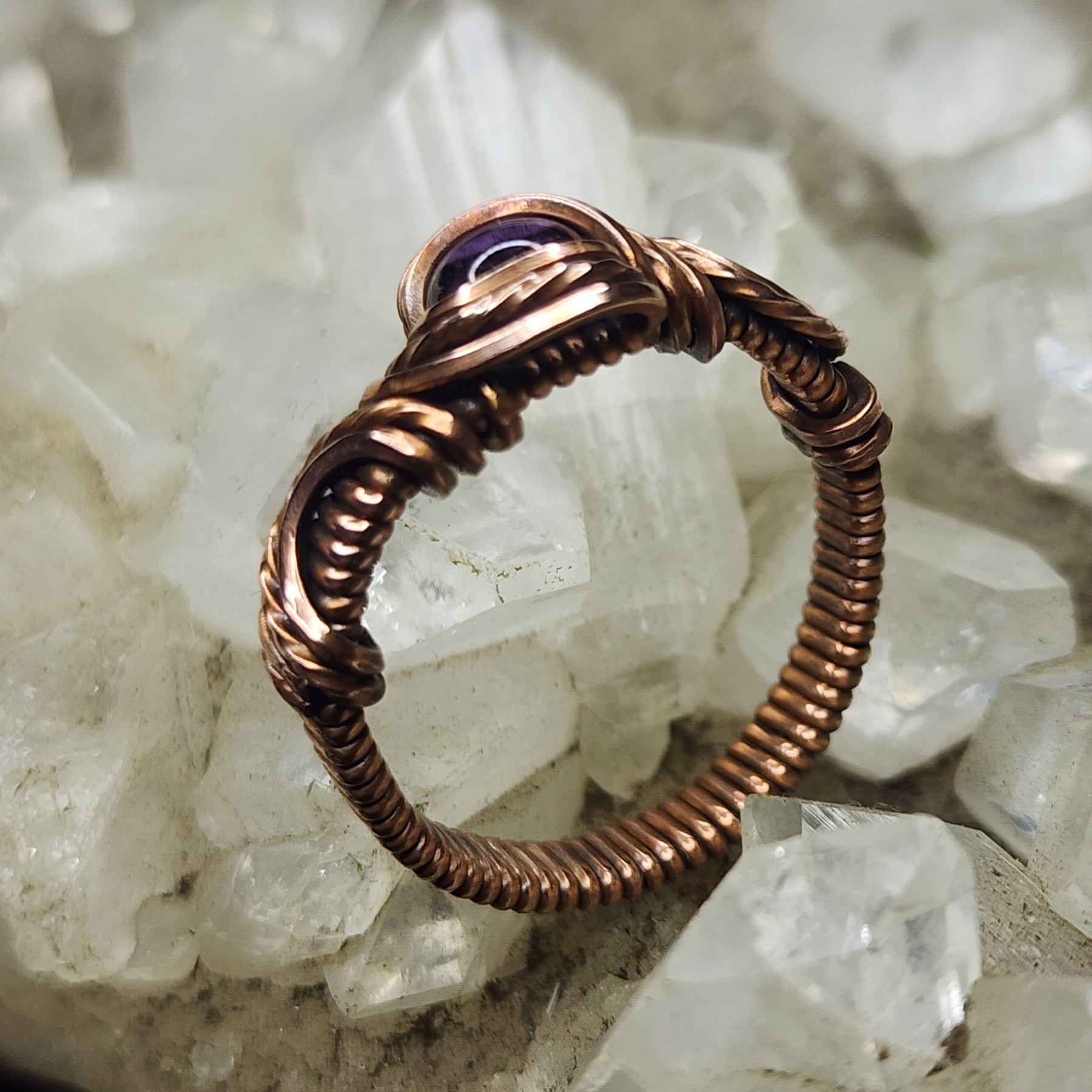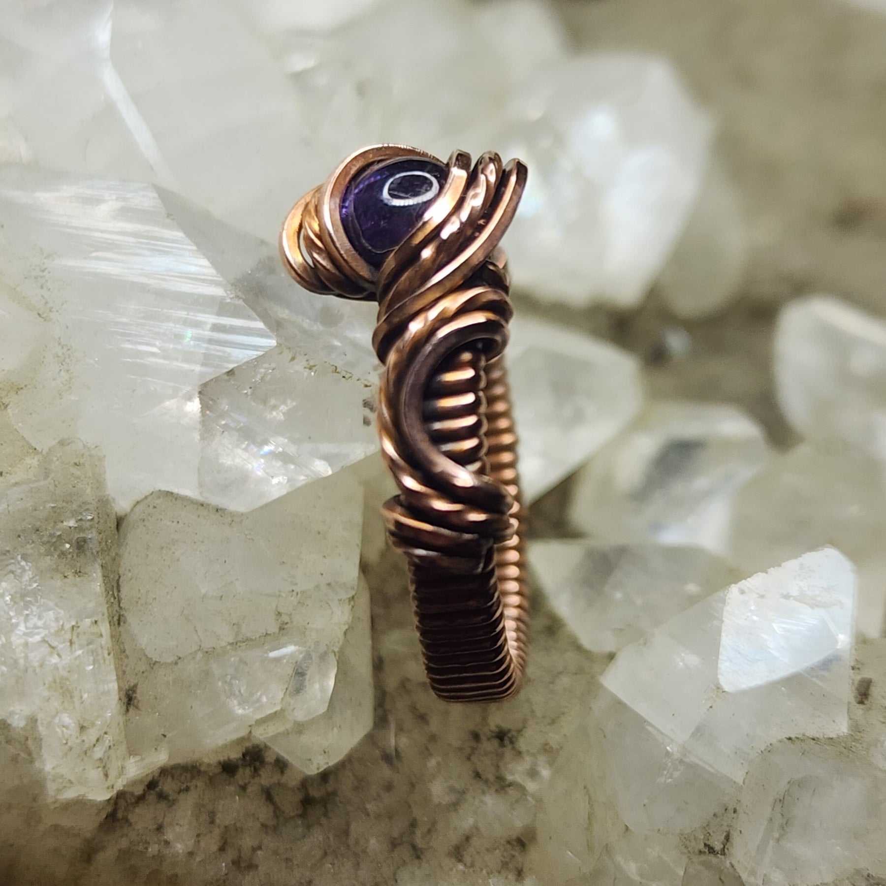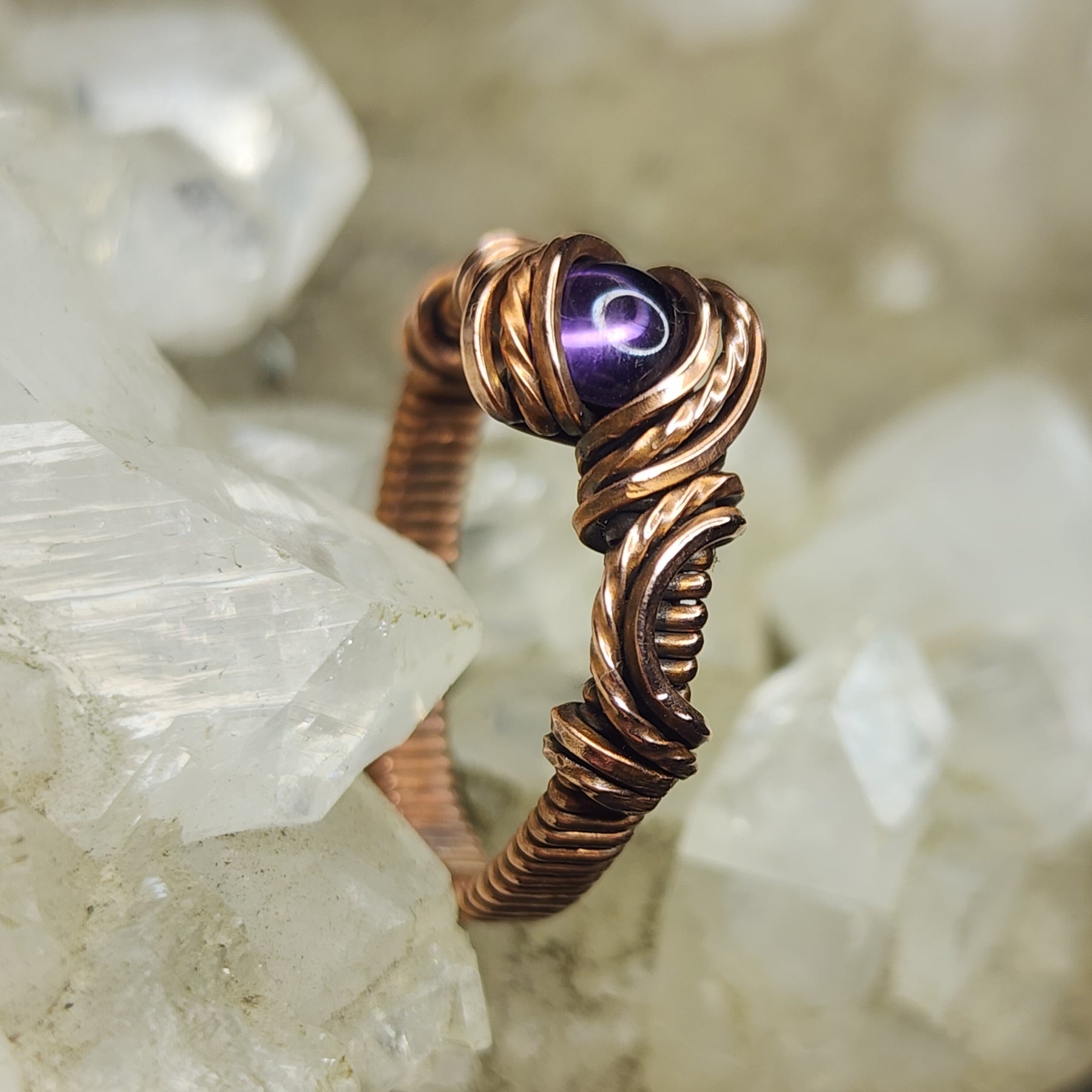 Amethyst wrapped in swirling Copper size 9.5 ring, antiqued and polished by hand.