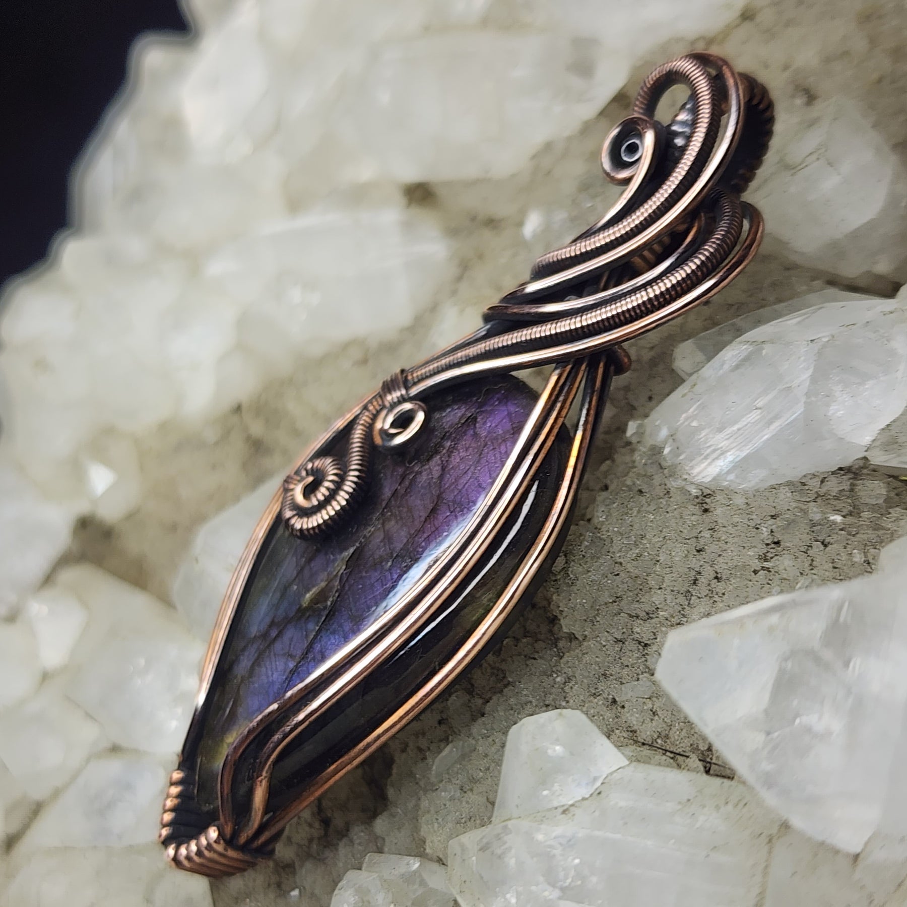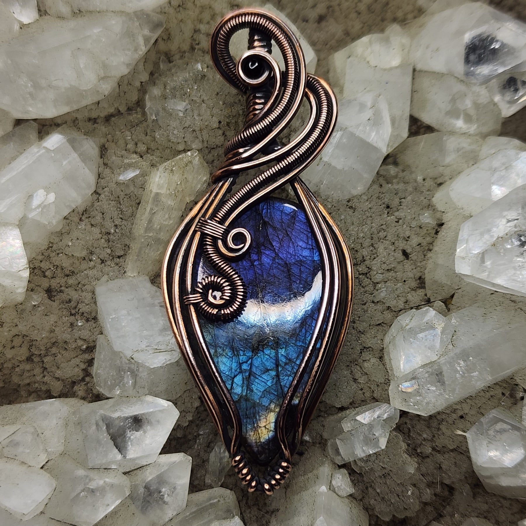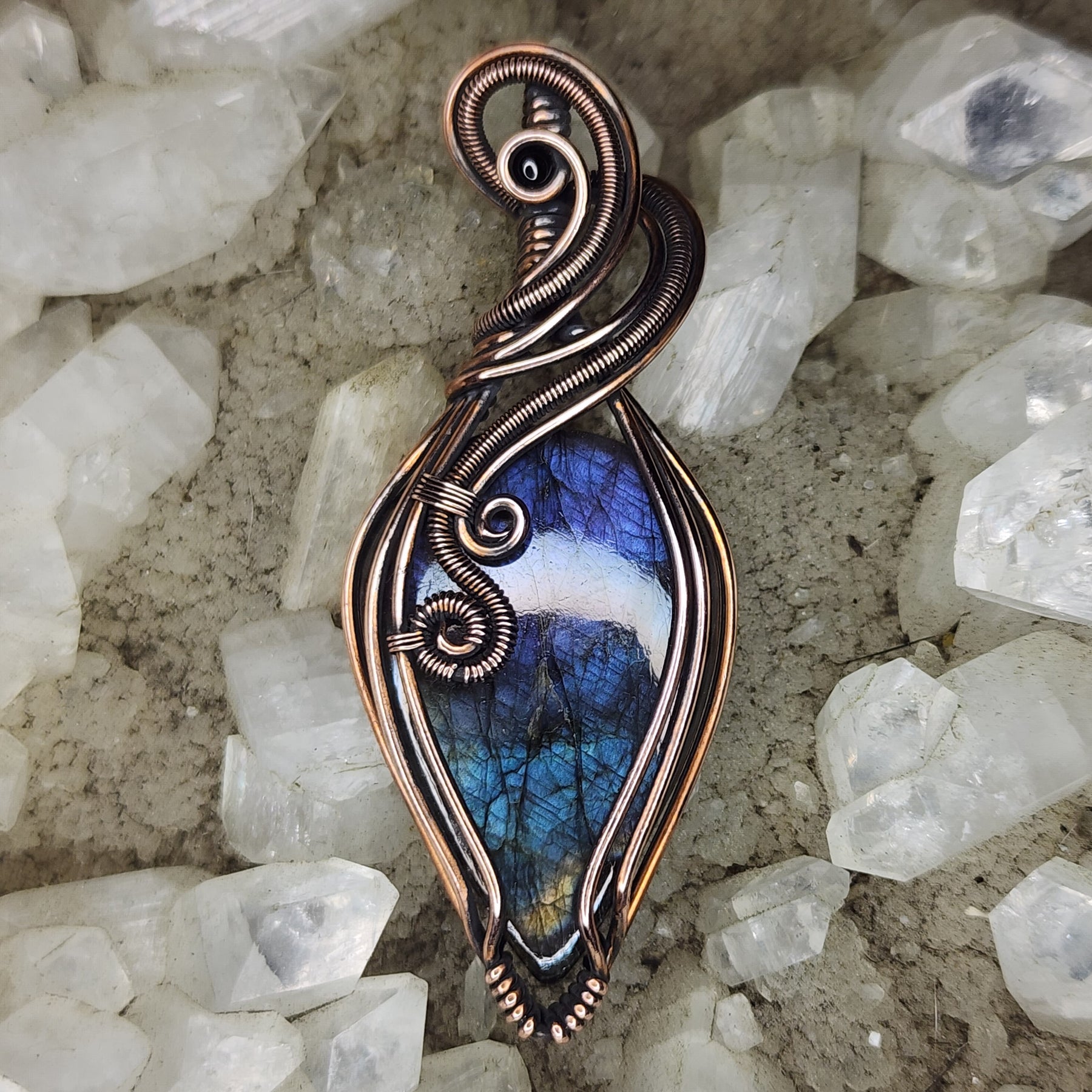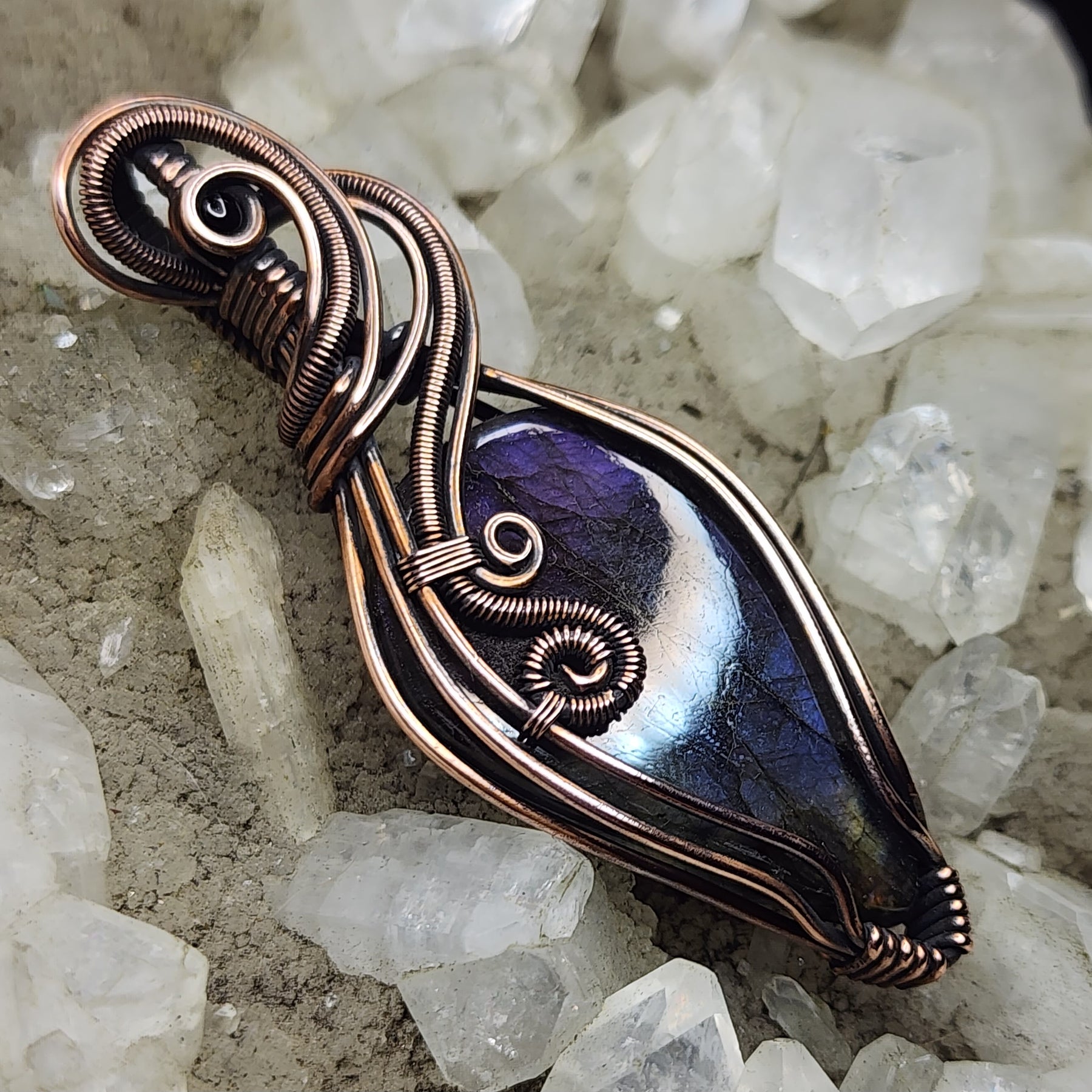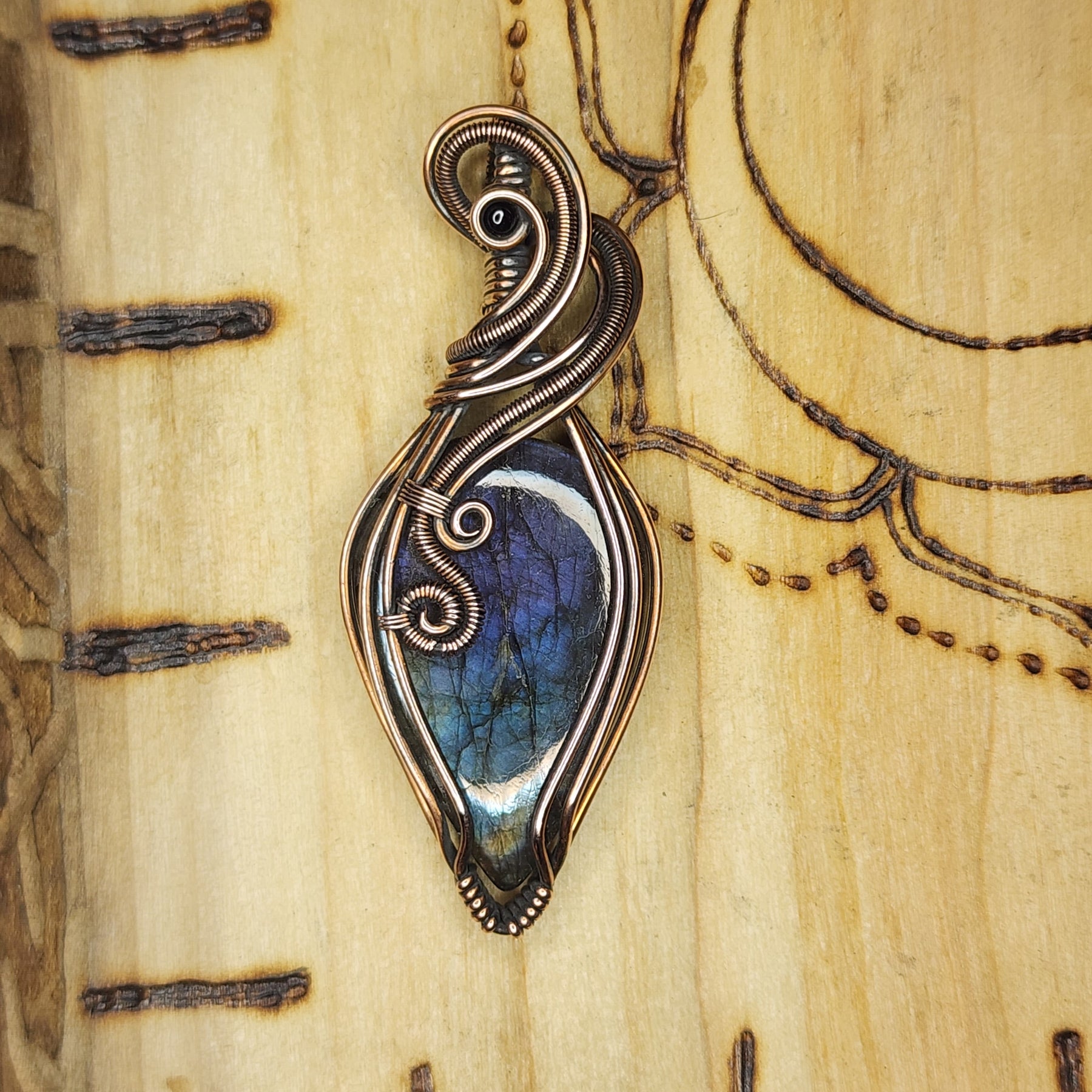 Labradorite and black onyx wrapped in swirling Copper, antiqued and polished by hand.