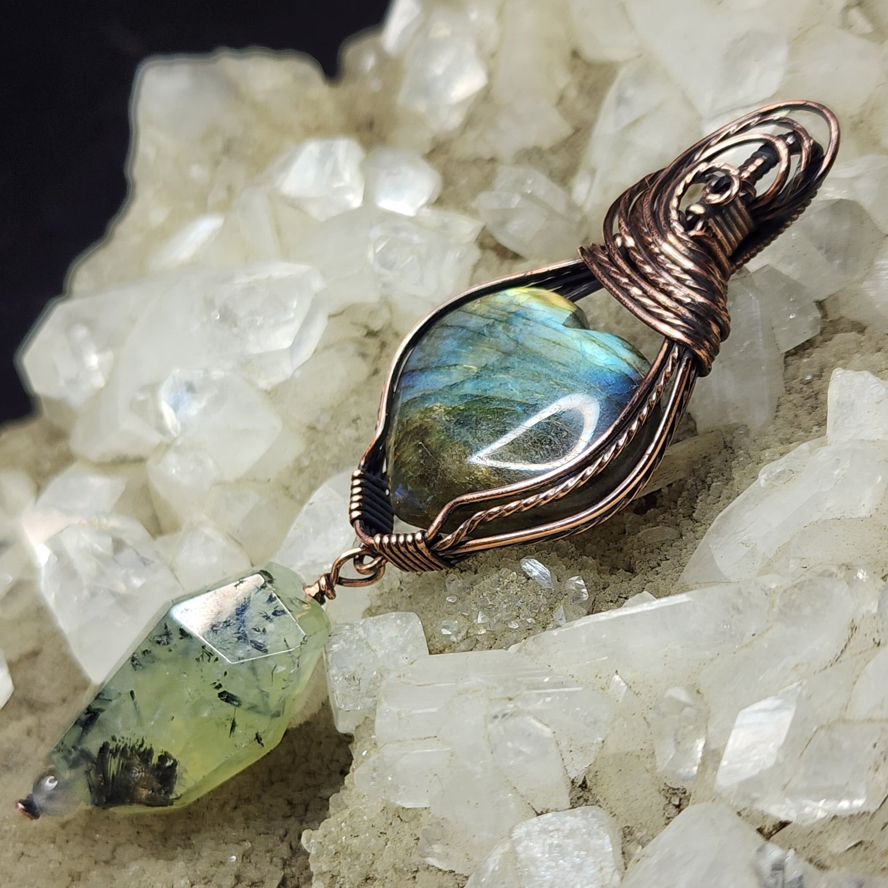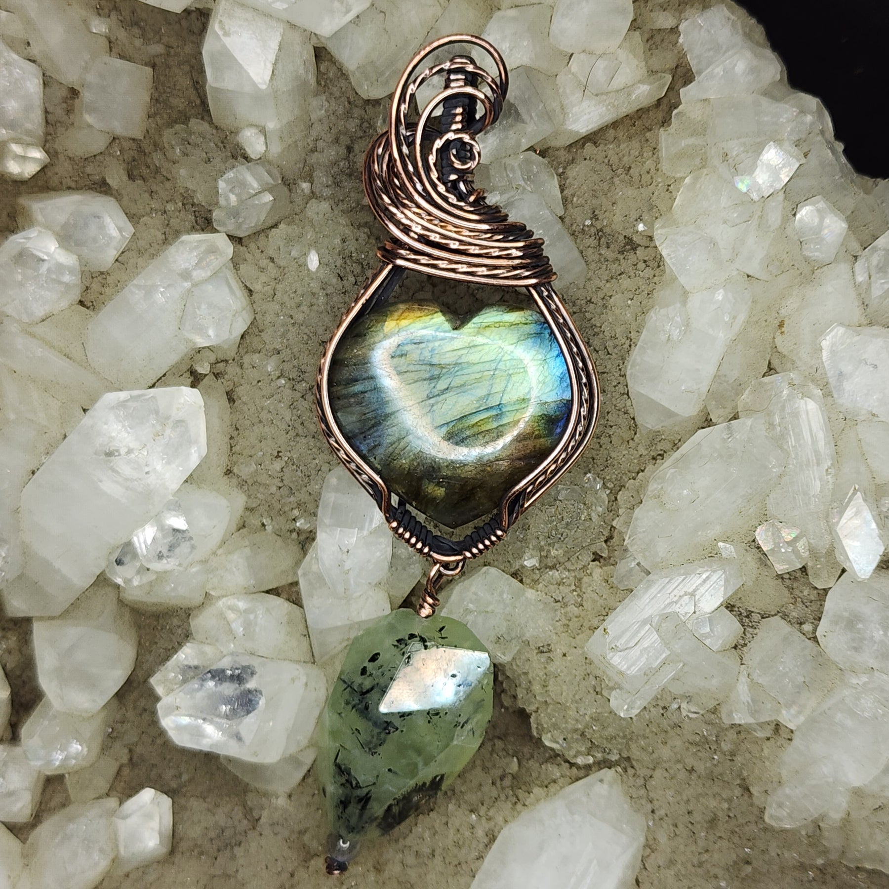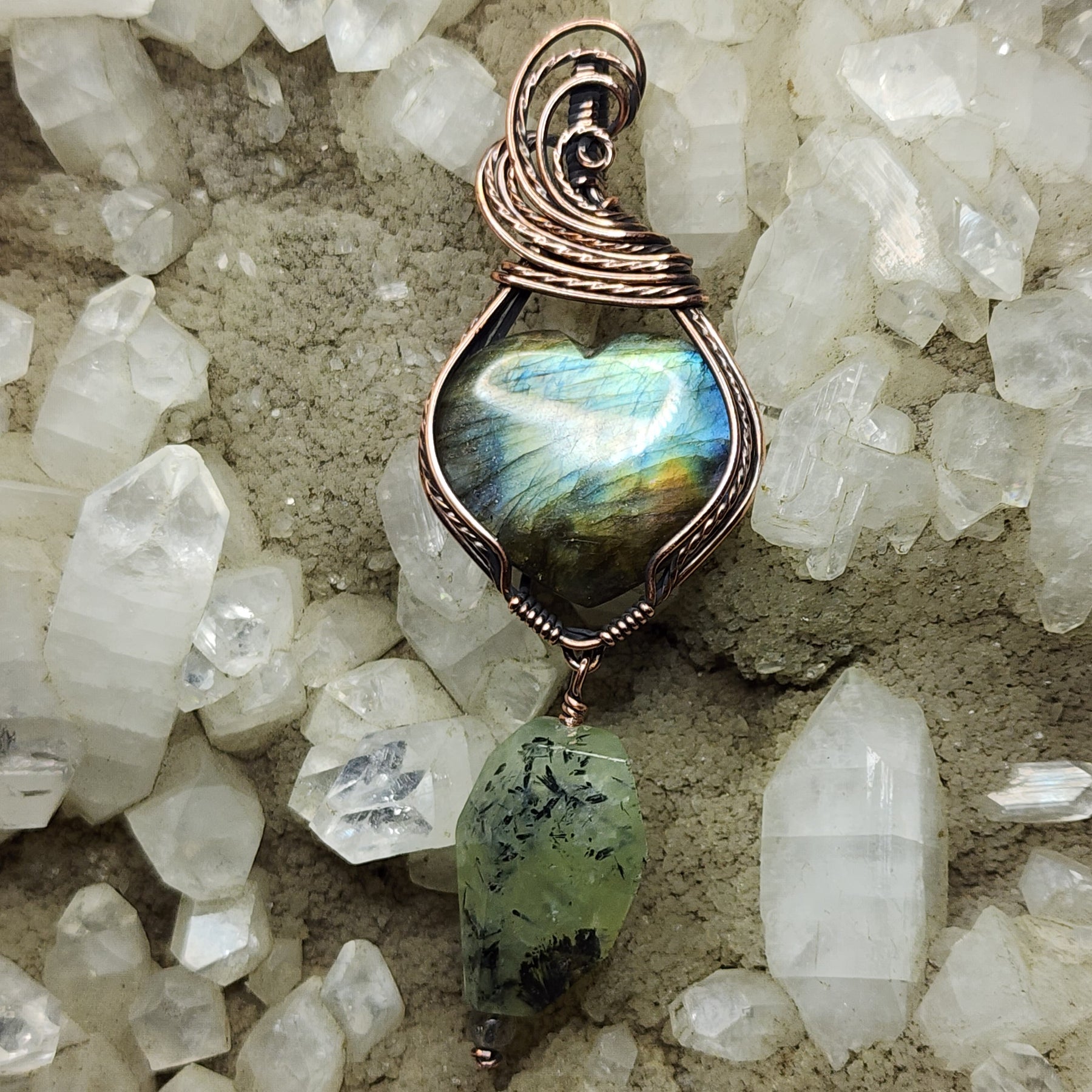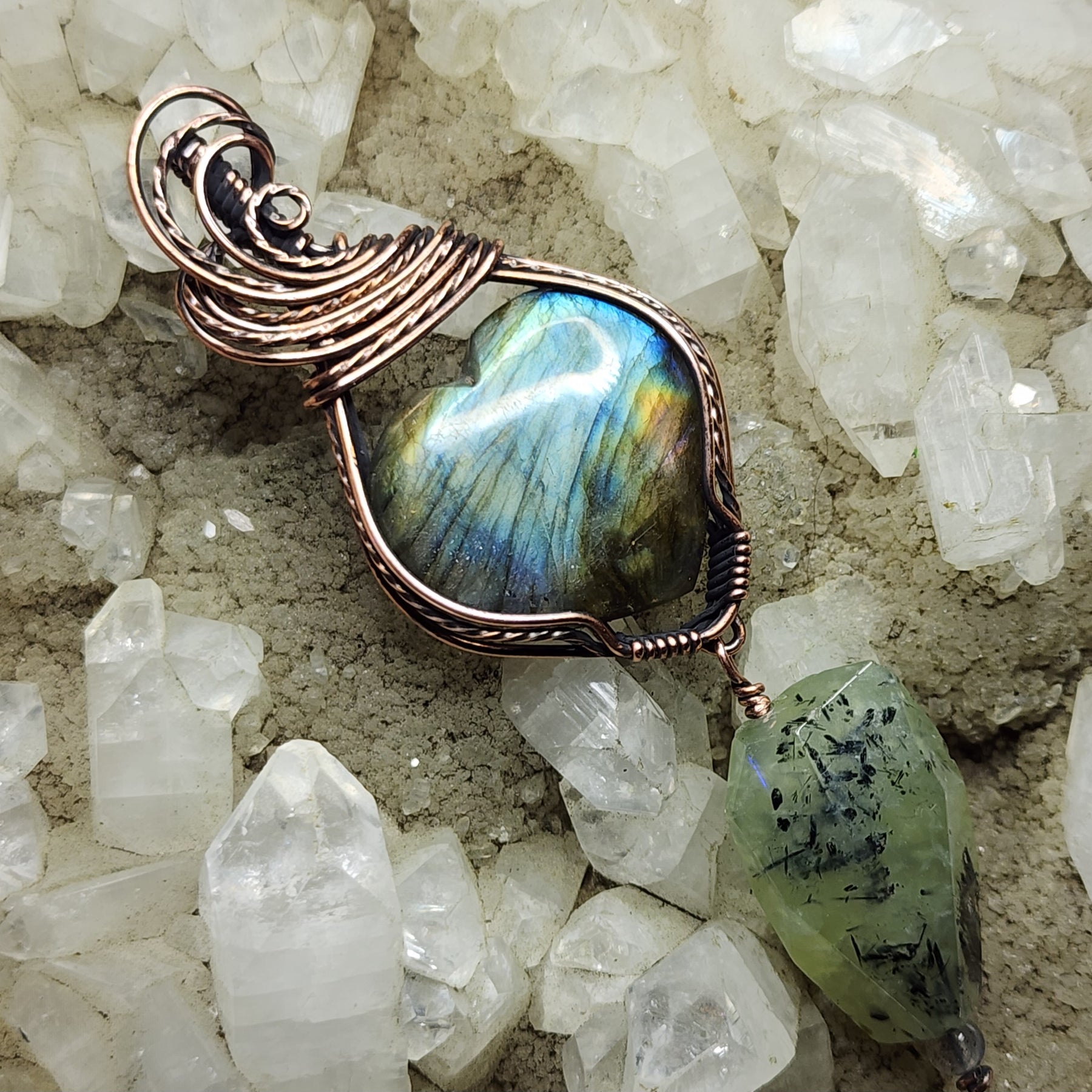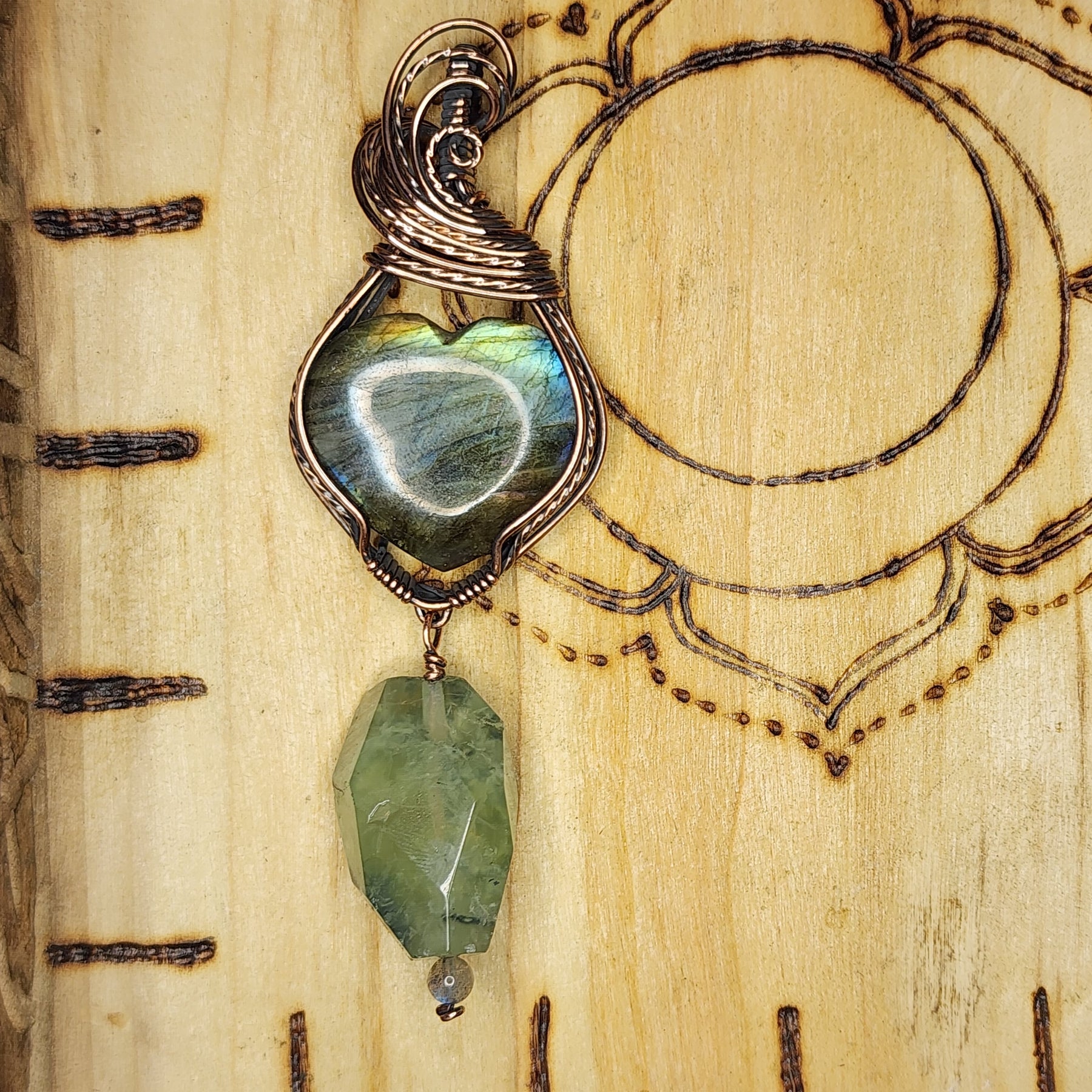 Labradorite heart carving and Prenhite with Epidote and Labradorite drop wrapped in swirling copper, antiqued and polished by hand.