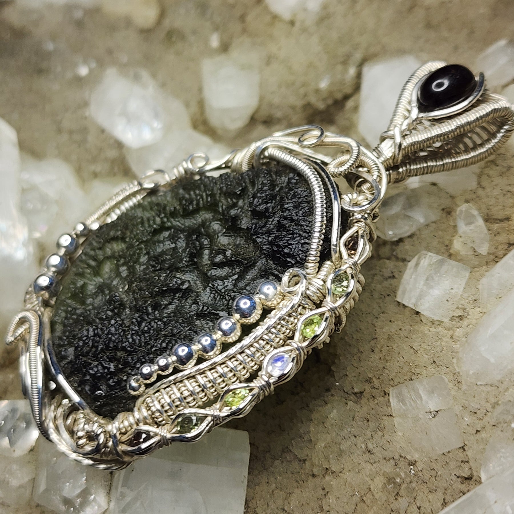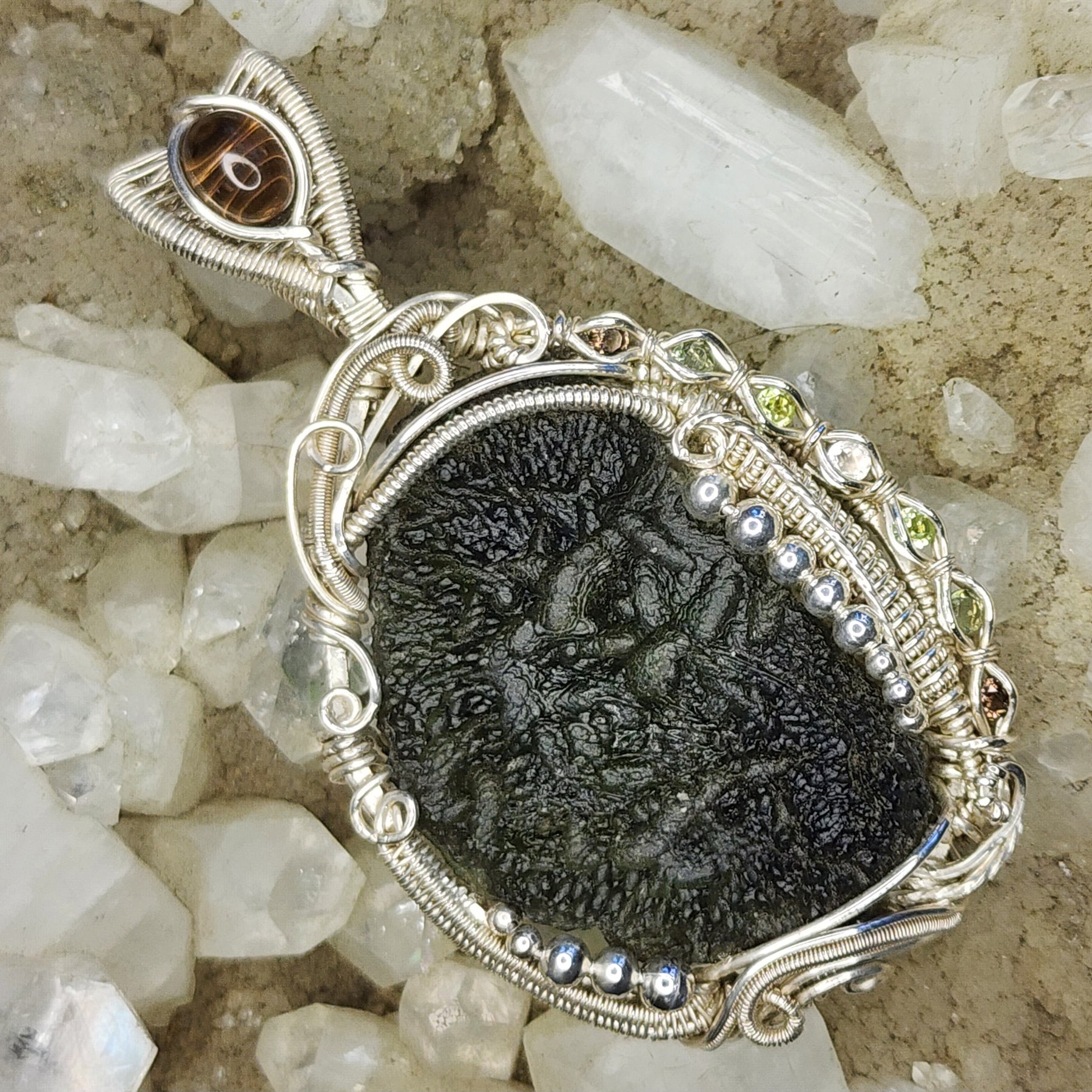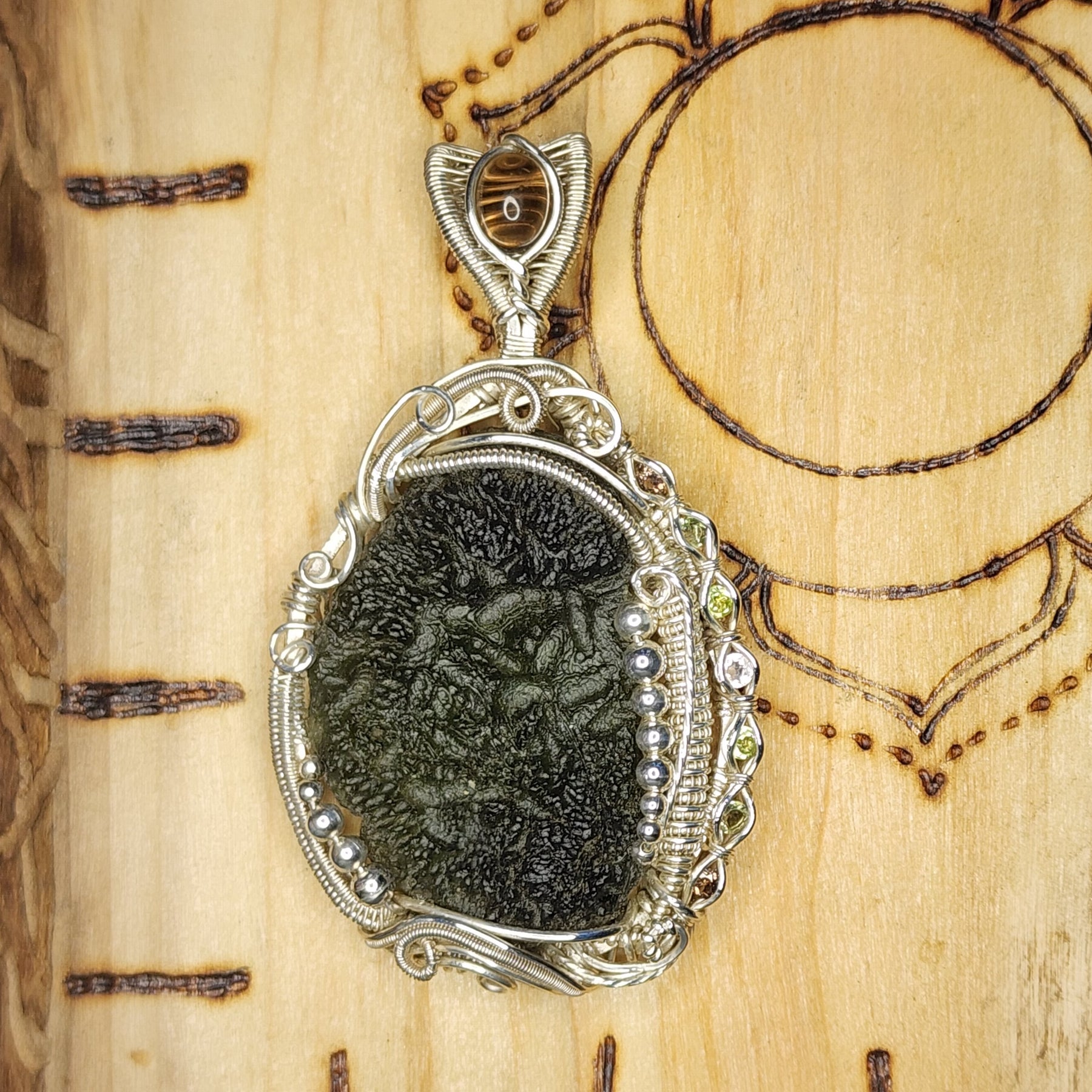 17 gram Moldavite accented with Smokey Quartz and a Channel of 2x Smokey Quartz, 2xMoldavite, 2x Peridot, and a Moonstone, all wrapped in solid Sterling Silver and polished by hand. Can be antiqued upon request.