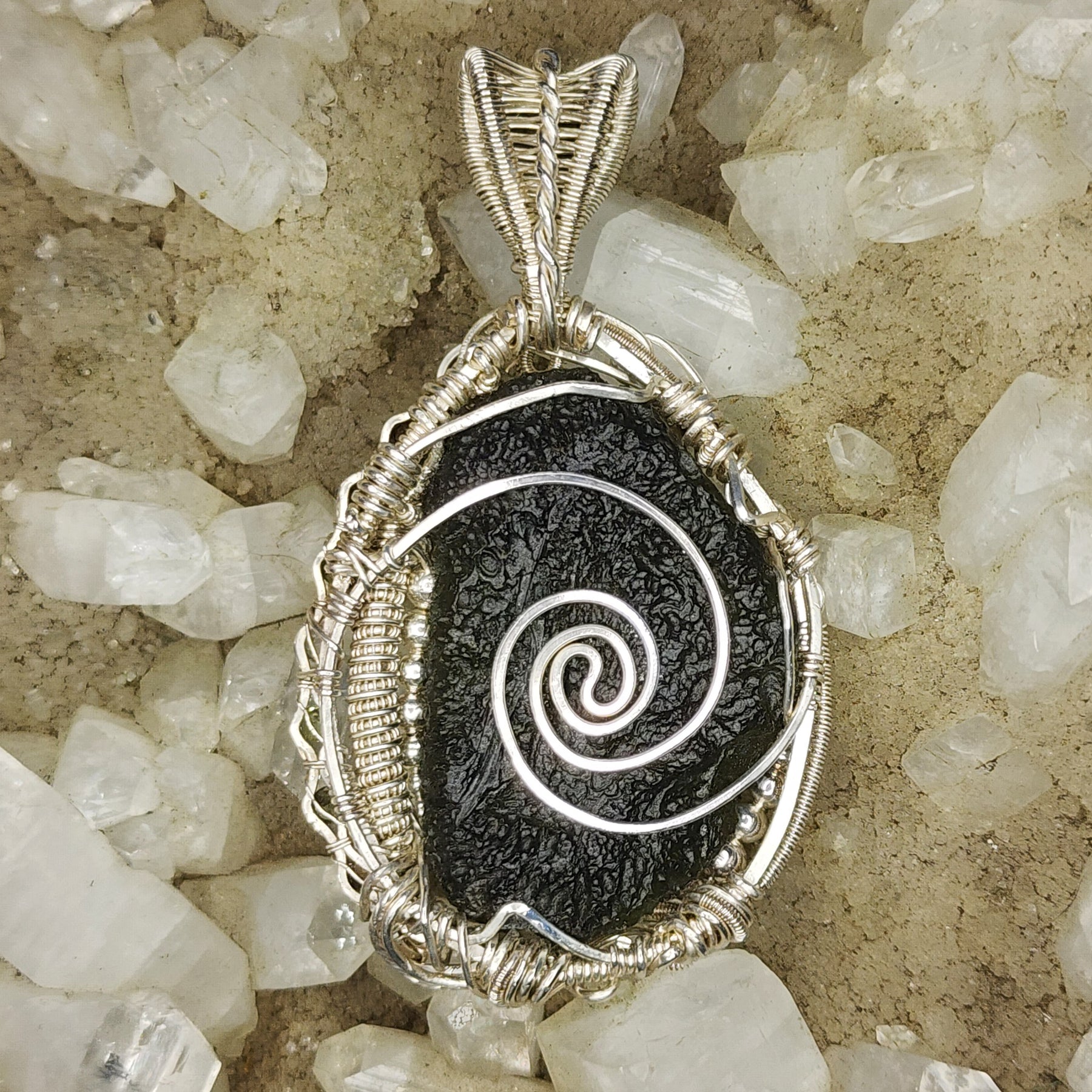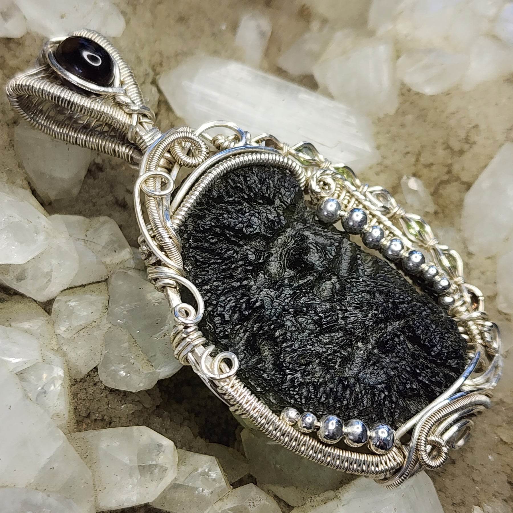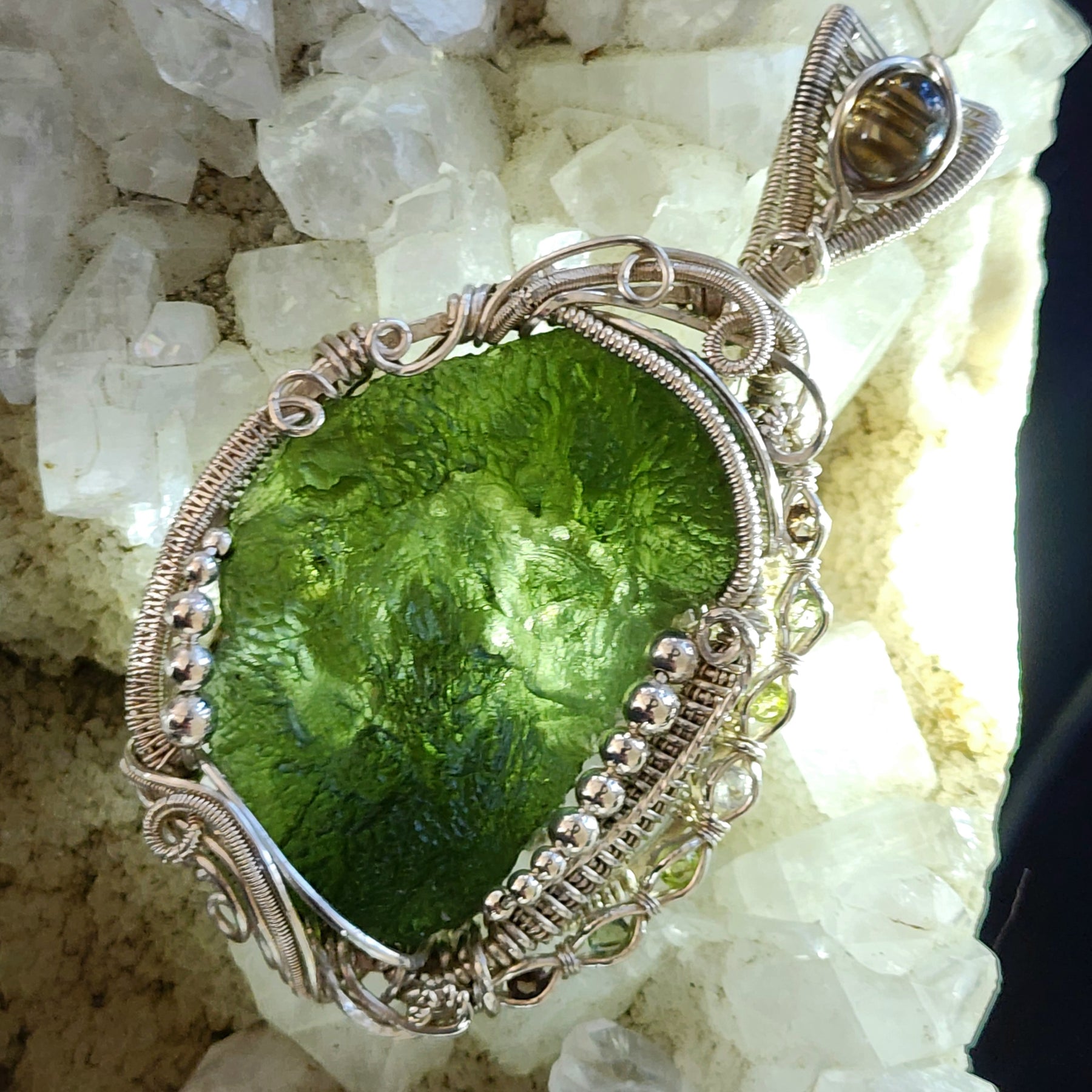 17 gram Moldavite accented with Smokey Quartz and a Channel of 2x Smokey Quartz, 2xMoldavite, 2x Peridot, and a Moonstone, all wrapped in solid Sterling Silver and polished by hand. Can be antiqued upon request.